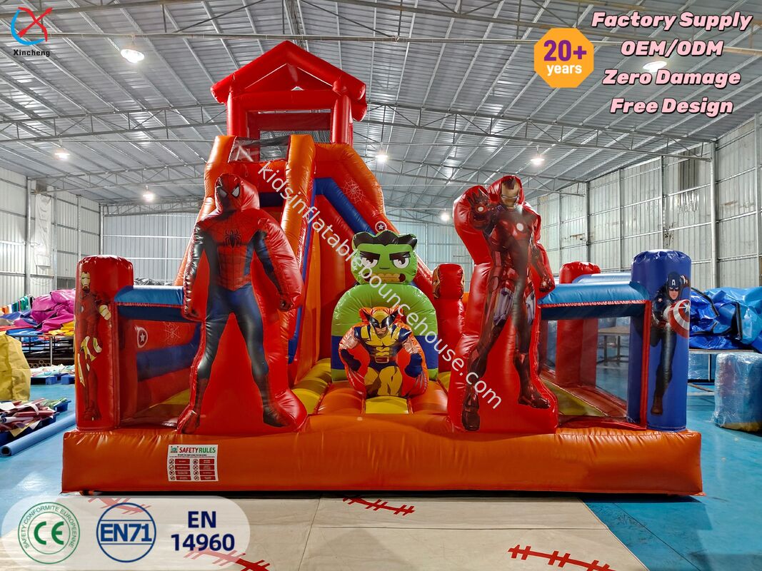 이 흥미진진한 어벤져스 테마의 인플레이터블 바운스 하우스는 슈퍼히어로 그래픽과 밝은 슬라이드를 특징으로 하여 몰입감 있는 놀이 경험을 선사합니다. 튼튼한 구조는 어린이 파티 및 이벤트에서 안전한 바운싱과 슬라이딩 재미를 보장합니다.